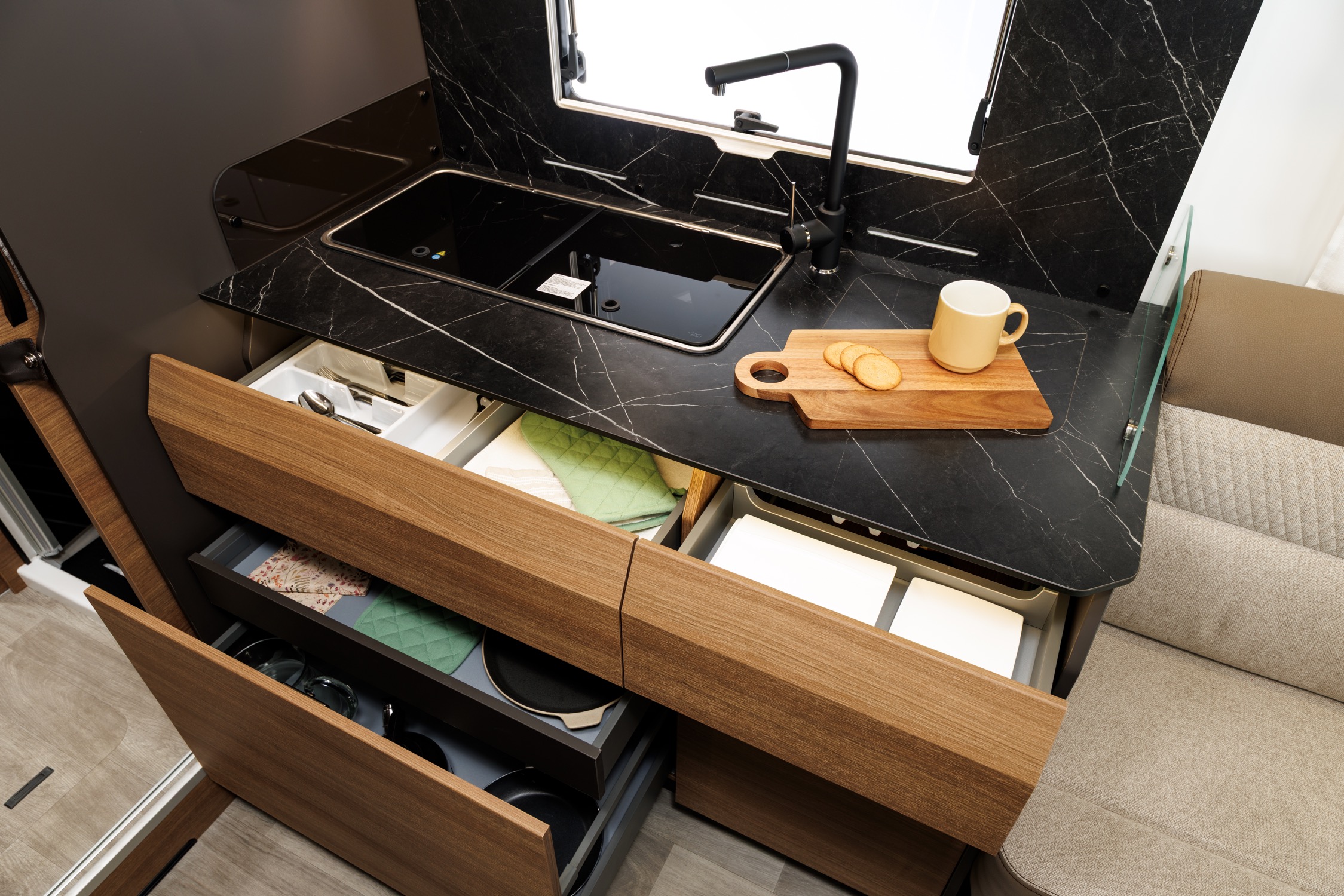 Der Benimar A967 verbindet Eleganz mit Funktionalität und bietet alles, was das Camperherz begehrt: zwei gemütliche Schlafplätze, eine modern ausgestattete Küche und jede Menge Raum zum Entspannen und Genießen.